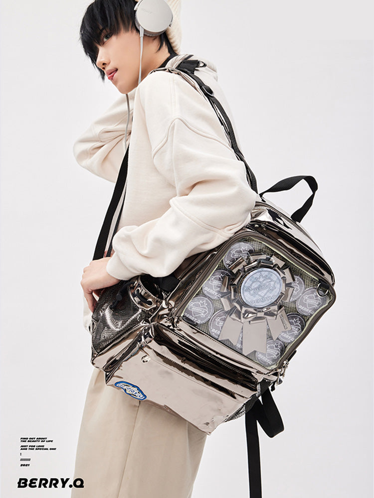 The bag material is soft and non-structured; minor creases at corners are normal. The mirror and holographic silver materials are reflective and may show marks—please purchase with care if concerned.